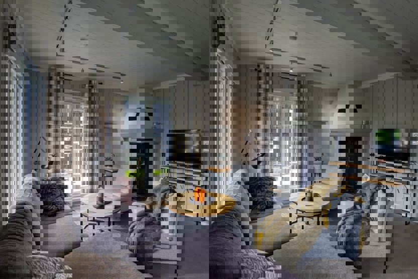 Gudbrandsgard Hytte 6, Flot renoveret hytte i hyggeligt hyttetun på østsiden af Kvitfjell. GudbrandGard hytterne har perfekt beliggenhed ved Mellomstasjonen og med Ski in / Ski out til alpint og langrend. Her er gåafstand til alle faciliteter: til børneområde, skiudleje, privatskiskolen. Langrendsløjper ca. 50 m. Østsiden i Kvitfjell, også kaldet "Mellomstasjonen", er kendt for Olympiabakken, hvor der årligt arrangeres World Cup i styrtløb og super-g. Her finder man noget virkelig udfordrende skiløb, selv for den bedste skiløber. Østsiden har dog også grønne, blå og røde piste, et fint børneområde, samt terrænpark. Ønsker man en pause fra pisten kan Skitorget byde på skicafé, afterski, købmand og når sulten melder sig flere spisesteder. Gudbrandsgard hotell tilbyder fx let frokost i lobbybaren eller på den solrige terrasse når vejret tillader det. På hotellet findes velværeafdeling, svømmebassin (mod betaling).