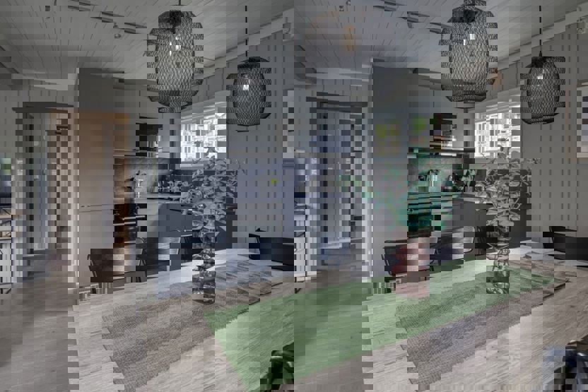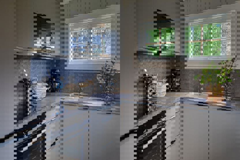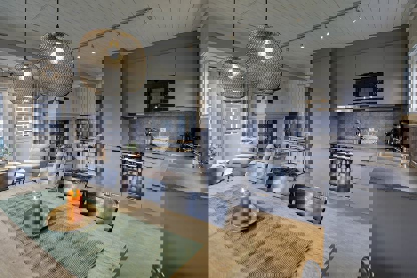 Enheden har komfur, ovn, køleskab, fryser, mikrobølgeovn, opvaskemaskine, kaffemaskine.