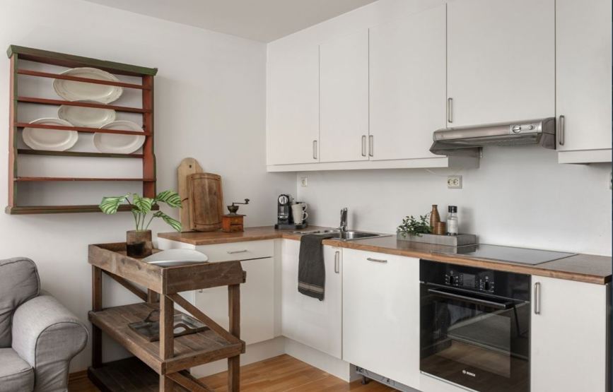 Enheden har komfur, ovn, køleskab, fryser, opvaskemaskine, mikroovn, kaffemaskine, Nespresso kapselmaskine