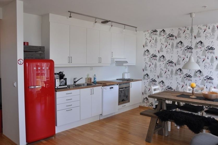 Enheden har komfur, ovn, køleskab, fryser, opvaskemaskine, mikroovn, kaffemaskine
