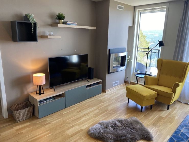 Etter en dag med aktiviteter kan du slappe av i stuen som er utstyrt med sofa, TV og gasspeis.