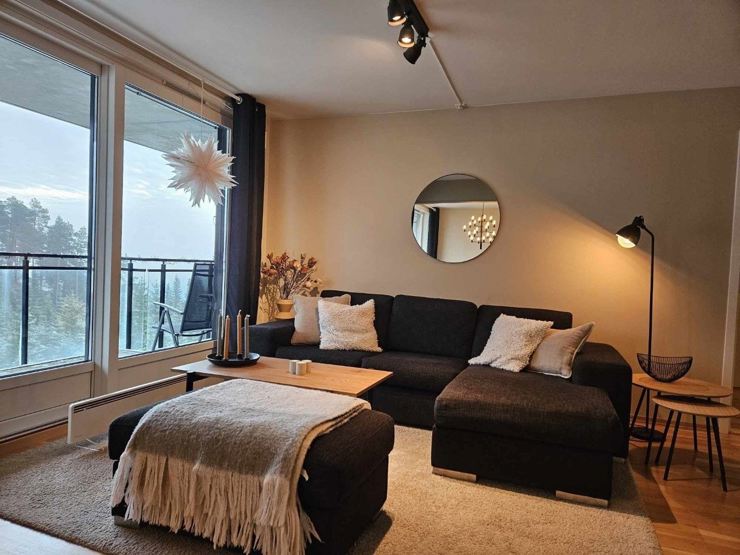 Etter en dag med aktiviteter kan du slappe av i stuen som er utstyrt med sofa, TV og gasspeis.