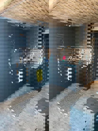 På kjøkkenet finner du komfyr, kjøleskap, fryser, oppvaskmaskin og kaffemaskin.