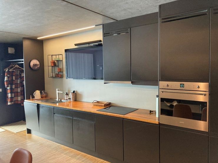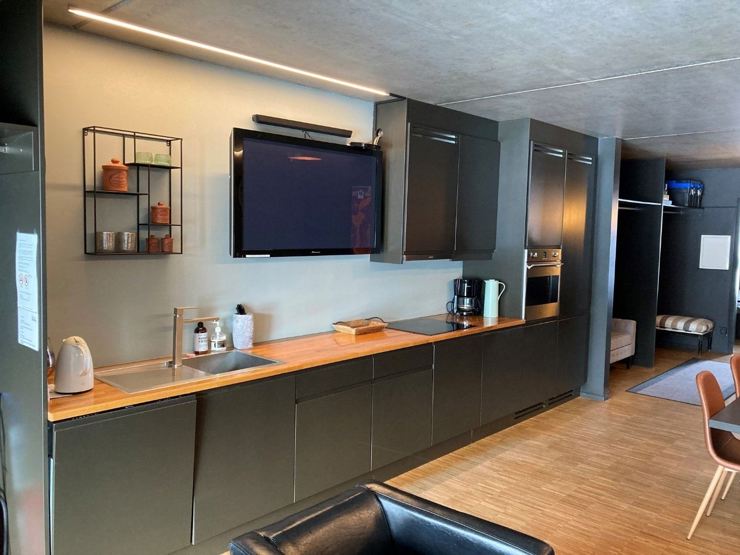 Enheden har komfur, ovn, køleskab, fryser, opvaskemaskine og kaffemaskine.