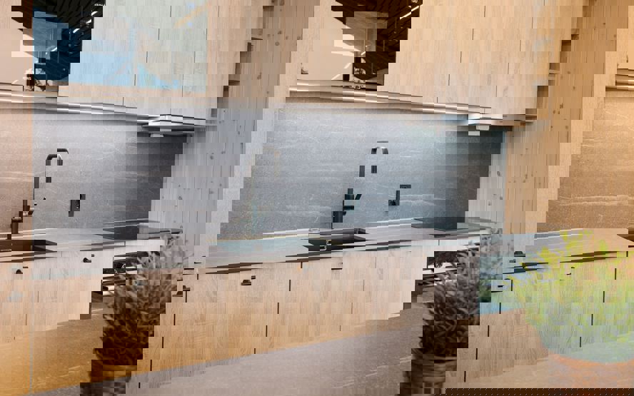 Enheden har komfur, ovn, køleskab, fryser, mikrobølgeovn, opvaskemaskine, kaffemaskine.