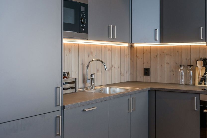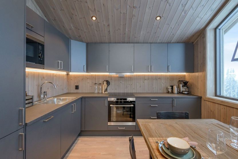 Enheden har komfur, ovn, køleskab, fryser, mikrobølgeovn, opvaskemaskine, kaffemaskine.