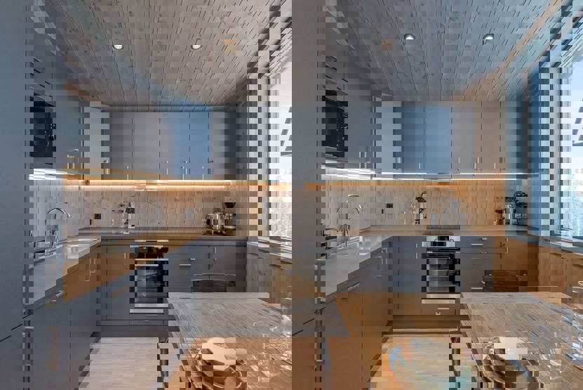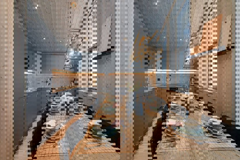 Enheden har komfur, ovn, køleskab, fryser, mikrobølgeovn, opvaskemaskine, kaffemaskine.