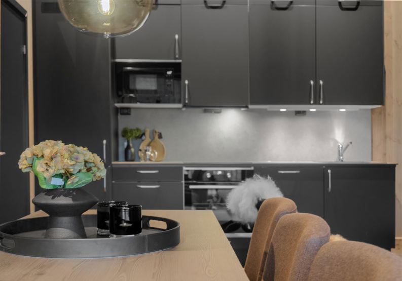 Enheden har komfur, ovn, køleskab, fryser, mikrobølgeovn, opvaskemaskine og kaffemaskine.