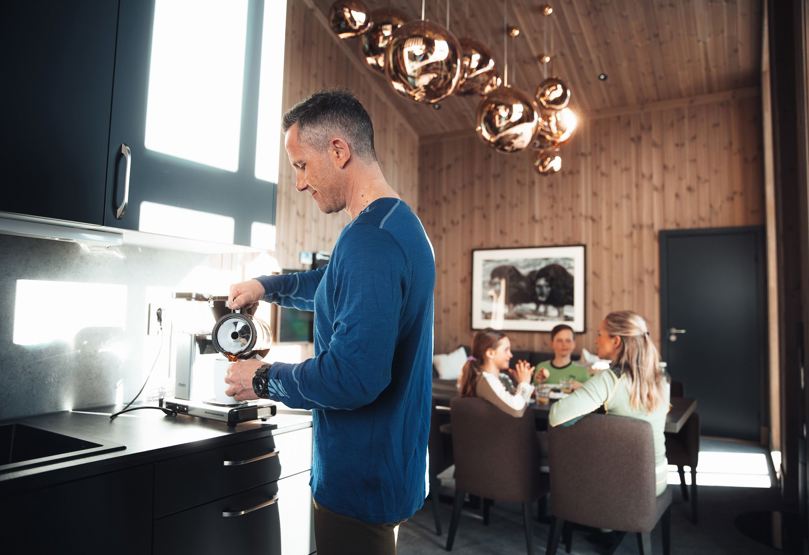 Enheden har komfur, ovn, køleskab, fryser, mikrobølgeovn, opvaskemaskine og kaffemaskine.
