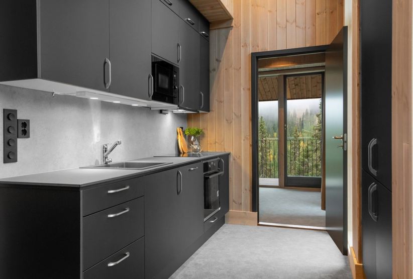 Enheden har komfur, ovn, køleskab, fryser, mikrobølgeovn, opvaskemaskine og kaffemaskine.