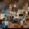Leiligheten har god takhøyde, og går over to plan. I 1. etg. er det spisestue og kjøkken, samt sofa, TV og peis. i 2. etg. er det en liten TV-stue.