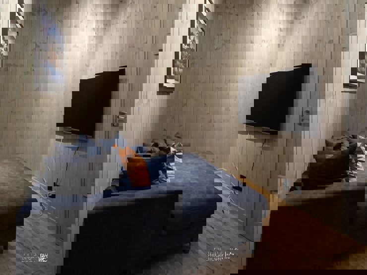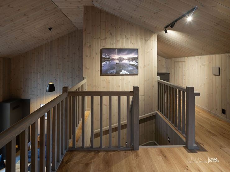 Leiligheten har god takhøyde, og går over to plan. I 1. etg. er det spisestue og kjøkken, samt sofa, TV og peis. i 2. etg. er det en liten TV-stue.