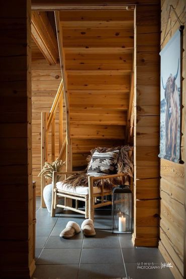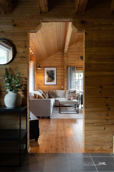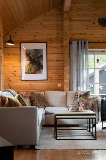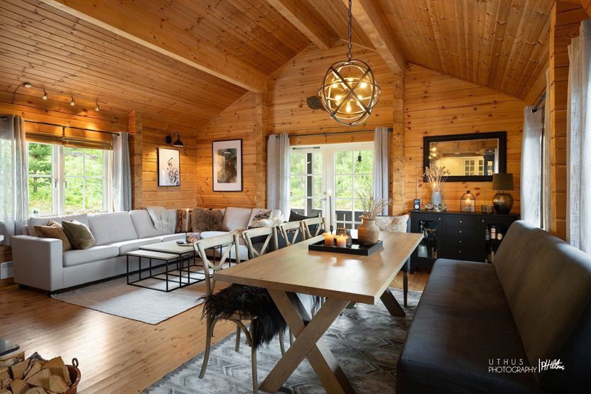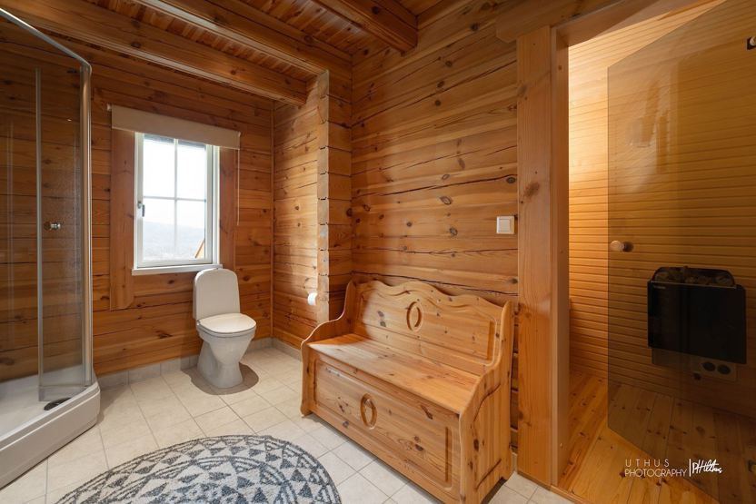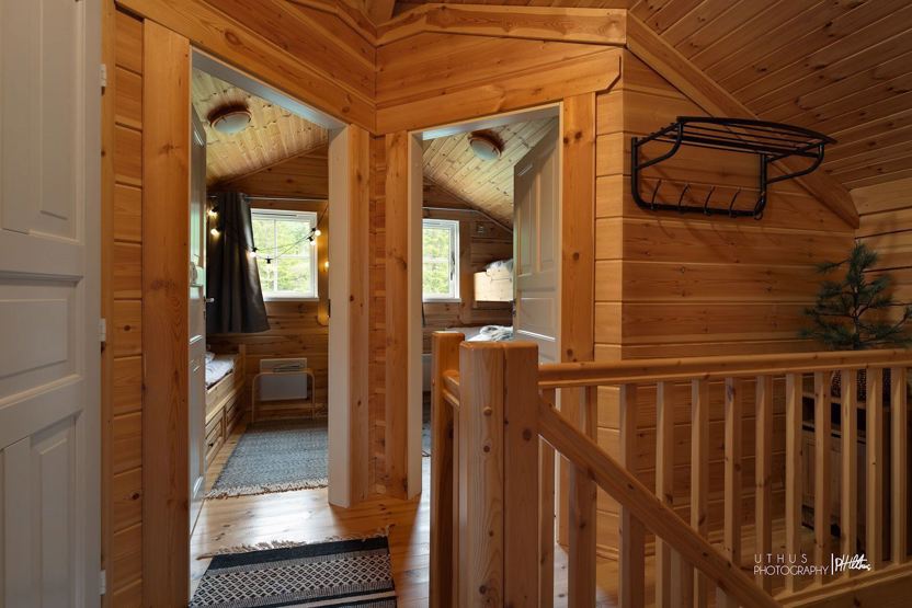 Hytta har en stor stue/spisestue med delvis åpen kjøkkenløsning. Det er ett fullverdig bad med badstue nede, samt separat WC.