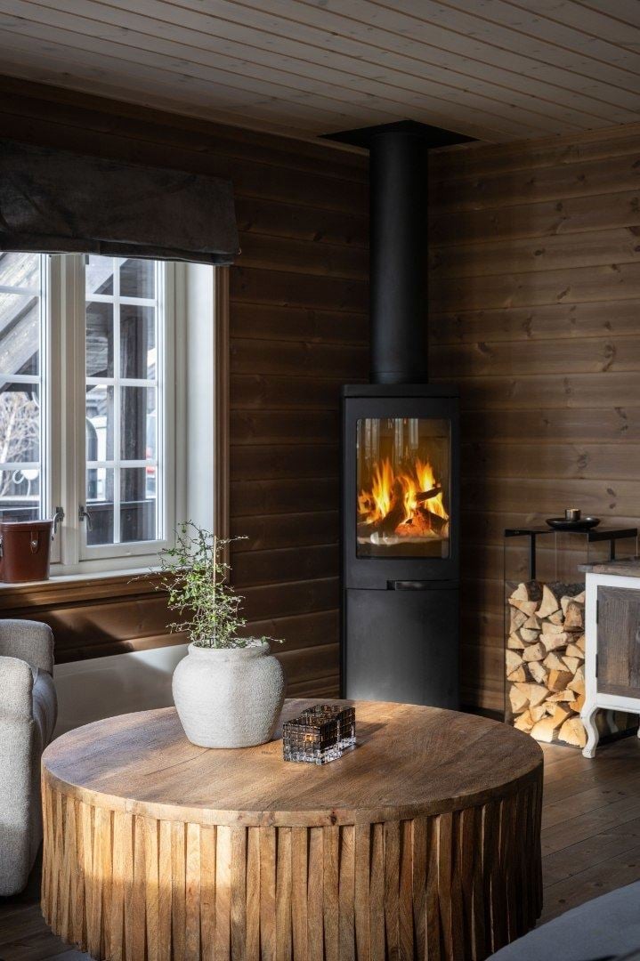 Peis og store vindusflater som gir rikelig med lys og utsikt.