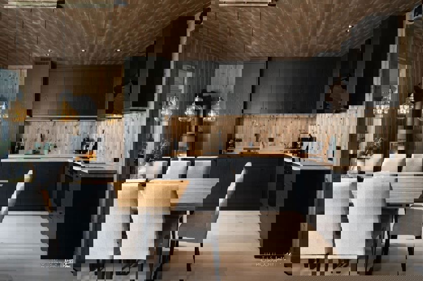 Leiligheten går over ett plan, med kjøkken, spiseplass og stue i åpen løsning og utsikt mot fjellene. Her er det lagt vekt på kvalitet i materialvalg og utførelse. Leiligheten har plassbygde senger og garderobeløsninger, og et kjøkken levert av lokalt møbelsnekkeri – en kombinasjon som gir både funksjon og særpreg.