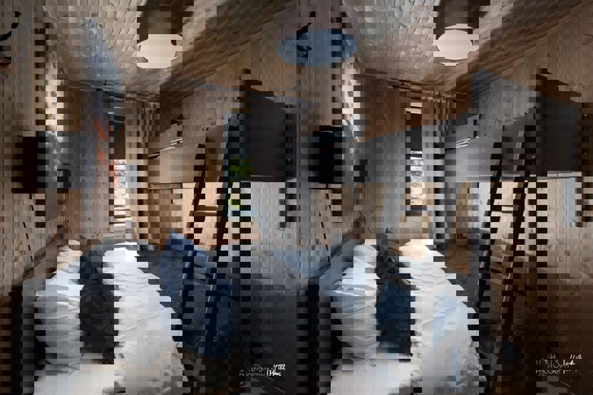 Soverom 2: Dobbeltseng + enkeltseng i plassbygd tverrstilt køyeseng