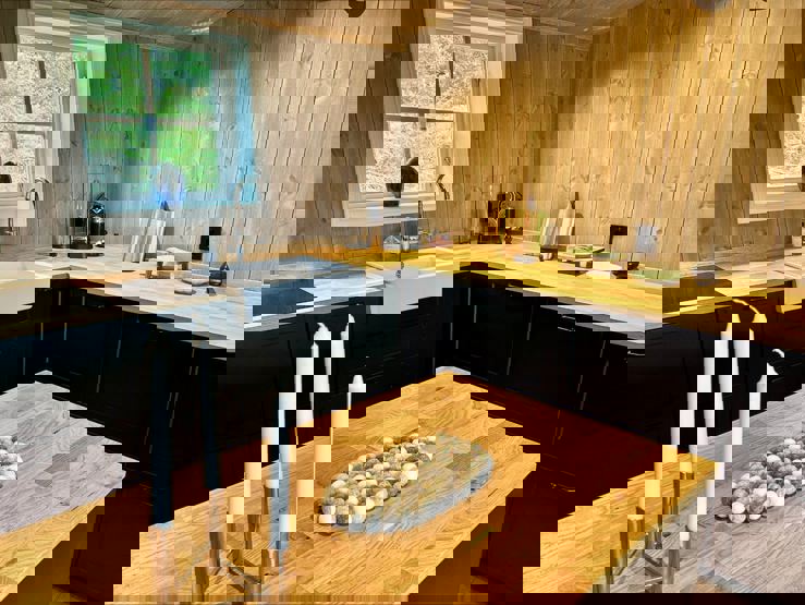 Gjestehuset har egen stue og sengeplasser. Underetasjen har vaskerom med dusj, i tillegg til badstue.