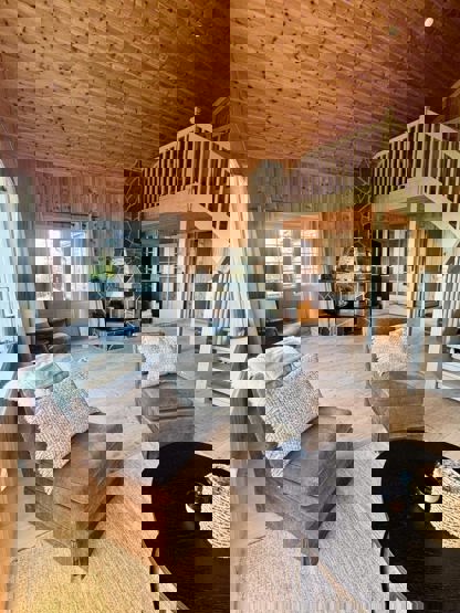 Hovedetasjen har blant annet 3 soverom, bad, åpen kjøkkenløsning med spisestue og stor terrasse. I tillegg er det loftetasje med flere sengeplasser og bod.