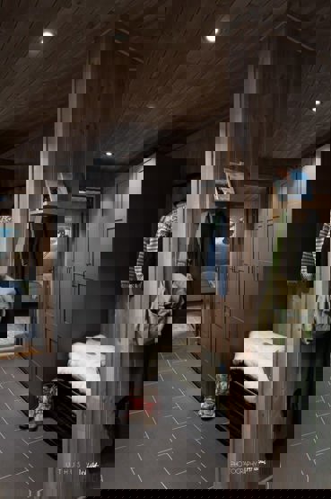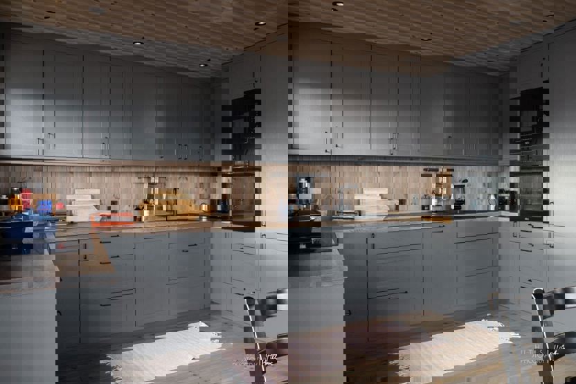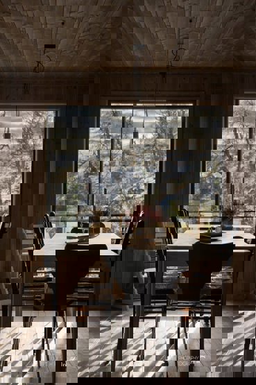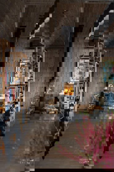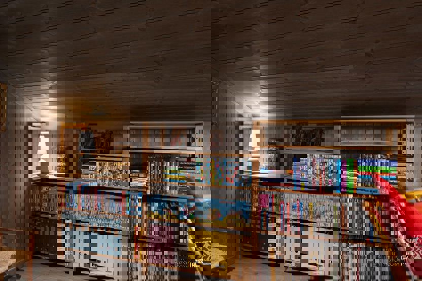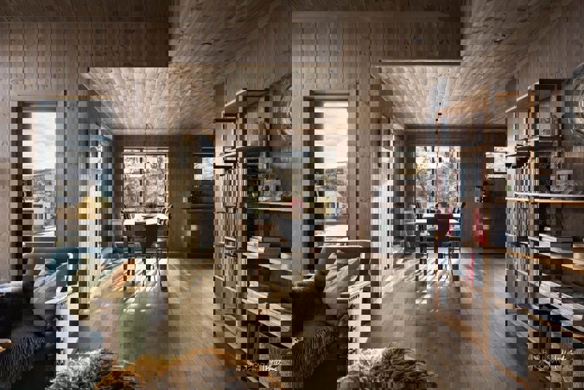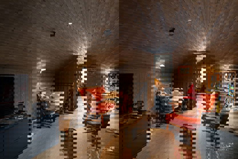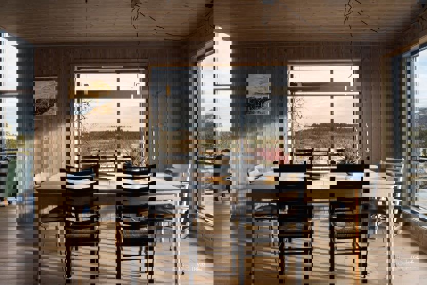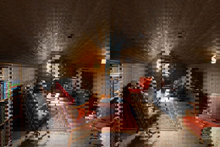 i 1 etg. finner du kombinert stue og kjøkken, med et langbord og peis, samt to fullverdige bad. I 2. etg finner du et sekundært oppholdsrom (loftsstue). På ett av badene finner du også en badstue.