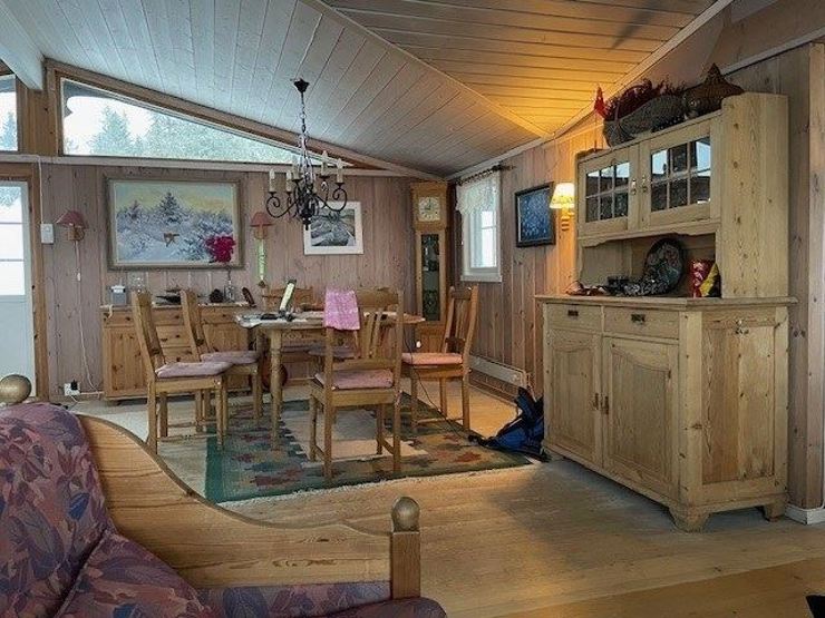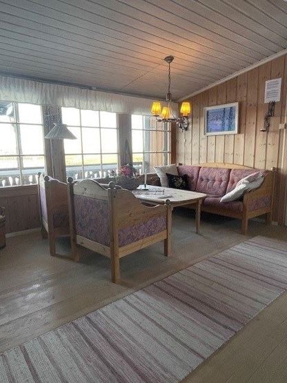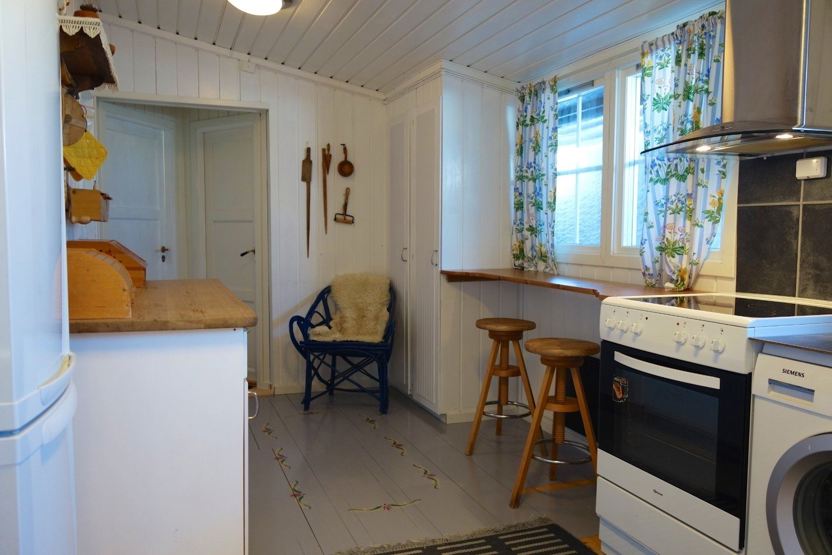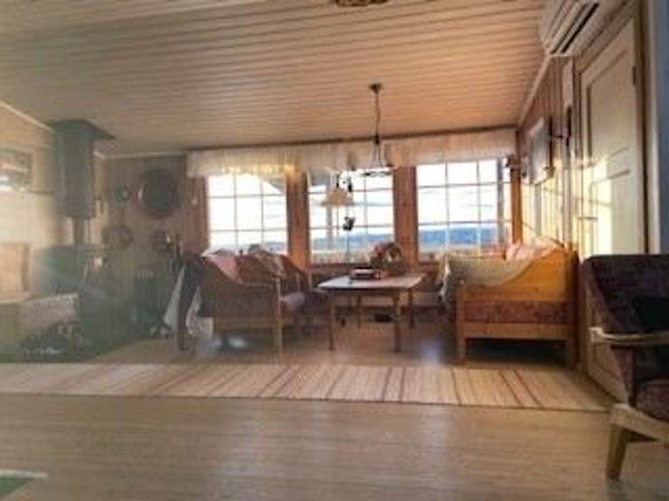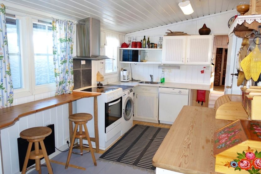 Kombineret stue / køkkenafdeling og spiseplads til 6 personer. Stue med TV og pejs. 1 bruser, 1 WC, sauna. Vaskemaskine.