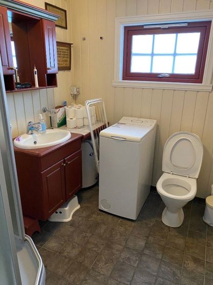 Bad med dusj og vaskemaskin.