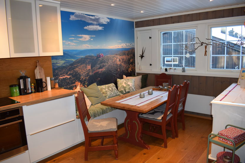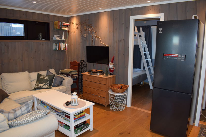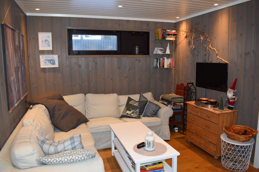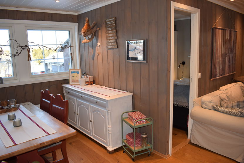 Stue og kjøkken i åpen løsning. Stue inneholder: Sofa, internett, TV. Spisebord med plass til 6 personer.