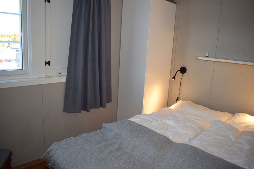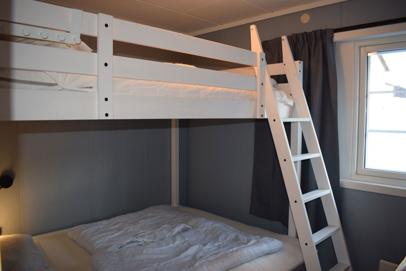 Soverom 1: 1 dobbeltseng. Soverom 2: 1 familiekøyeseng (begge køyer 150 cm brede, overkøye meget lav takhøyde).