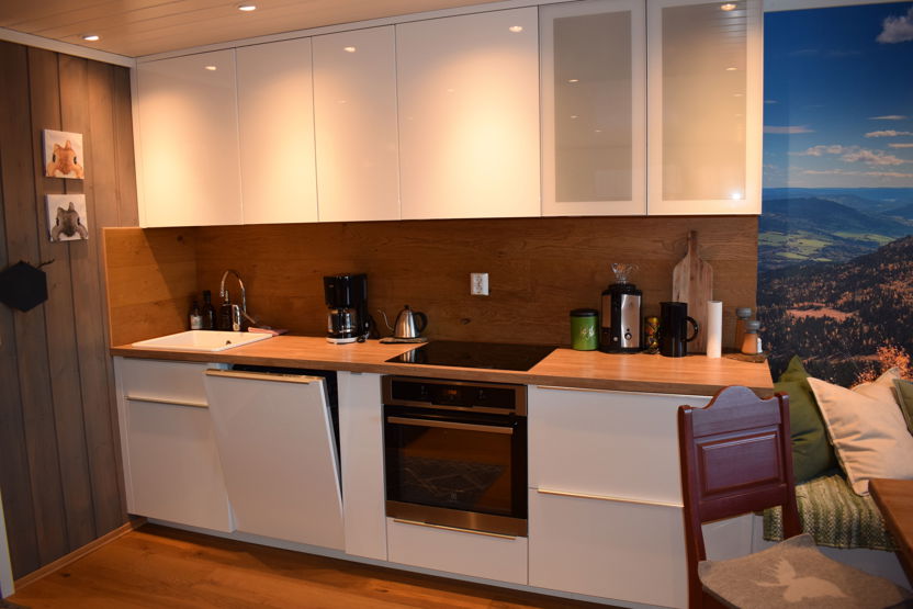 Kjøkken utstyrt for selvhushold: Stort kjøleskap med fryser, komfyr med 4 plater, oppvaskmaskin, kaffetrakter og vannkoker.