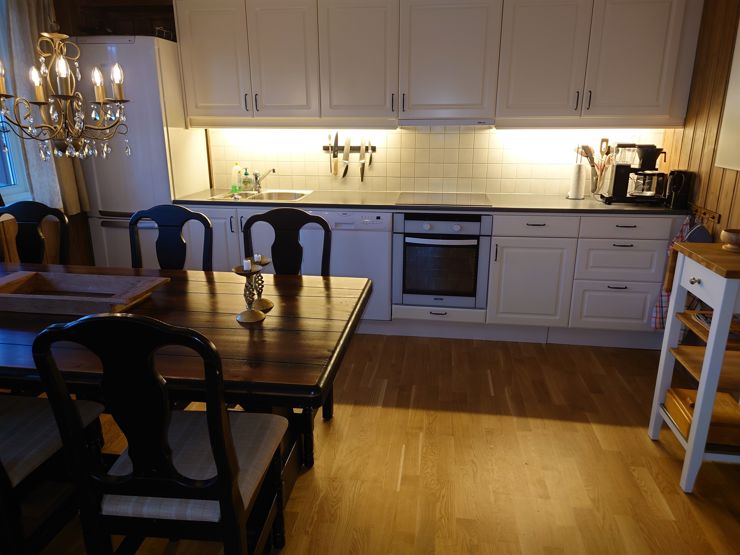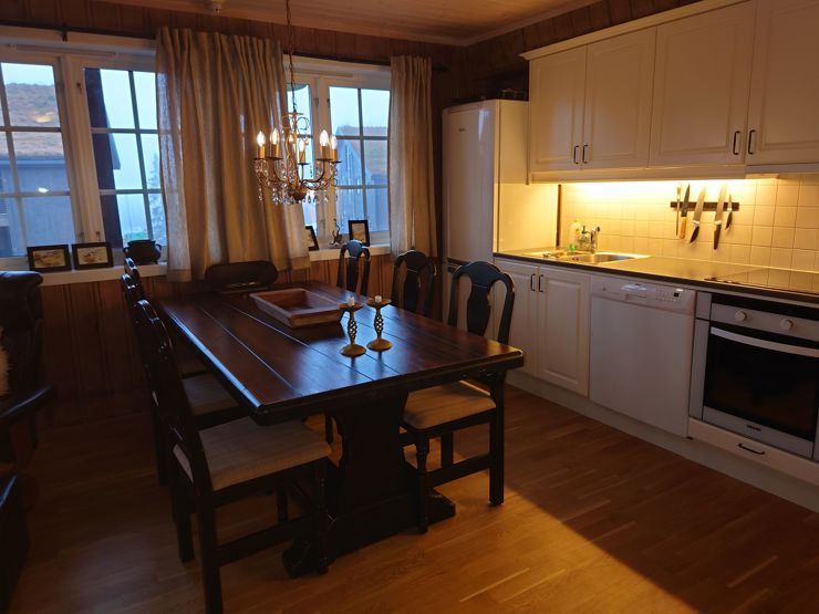 Enheden har komfur med ovn, opvaskemaskine, køleskab med fryser, Lille bord med 6 stole.