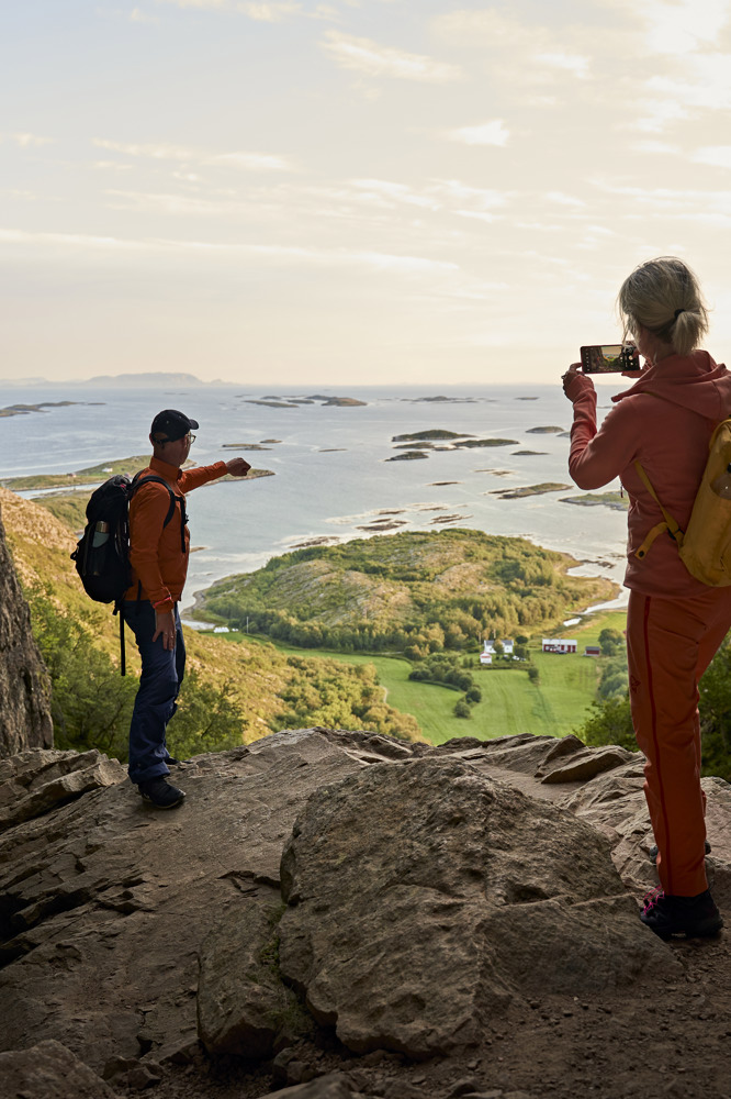 I roligt tempo tager det cirka en time at gå til hullet i Torghatten på en tilkøbsudflugt. Panoramaudsigten over træerne og øerne, der strækker sig ud foran os, er det hele værd.