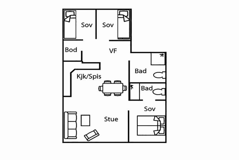 Lejlighed på 2 sal, 4 sengepladser, 74 m², opholdsstue med gaspejs, TV og køkkenafdeling, 3 soveværelser, 2 brusere, 2 WC. Skiopbevaring, 1 garageplads, maks højde garageplads 220 cm, tørrerum.