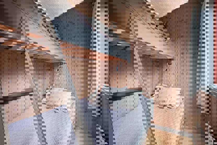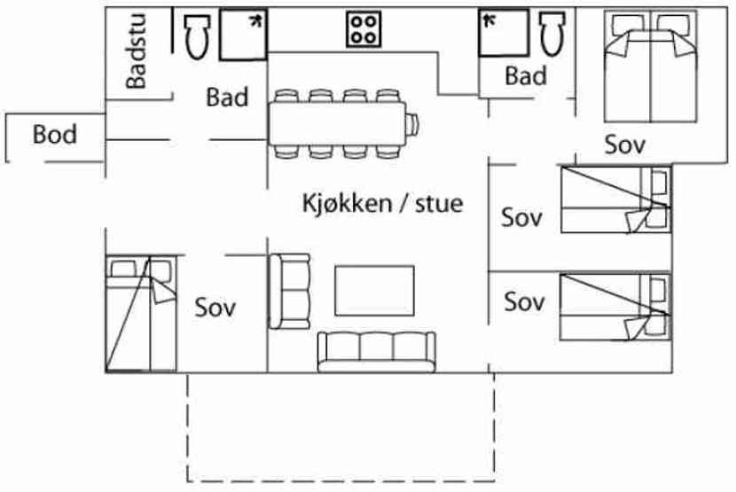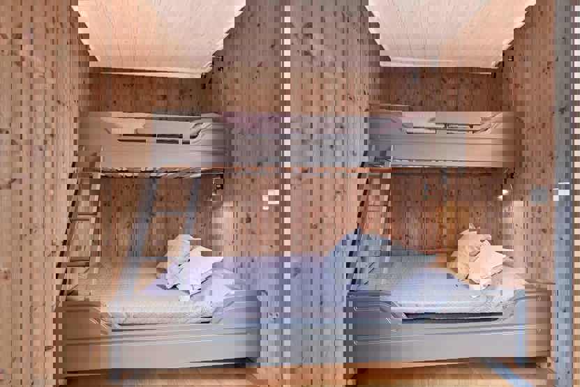 Soveværelse 1: 1 dobbeltseng. Soveværelse 2: 1 køjeseng med 120 cm bred underkøje. Soveværelse 3: 1 køjeseng med 120 cm bred underkøje. Soveværelse 4: 1 køjeseng med 120 cm bred underkøje.