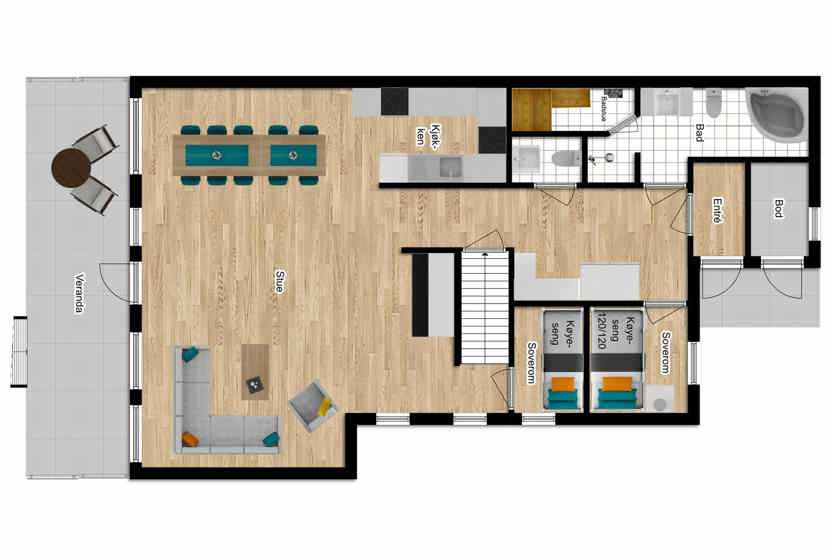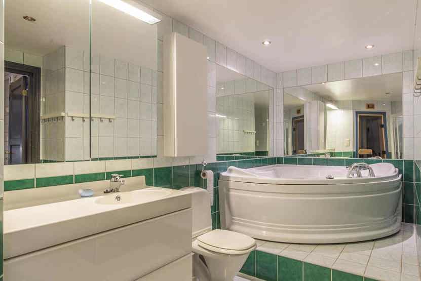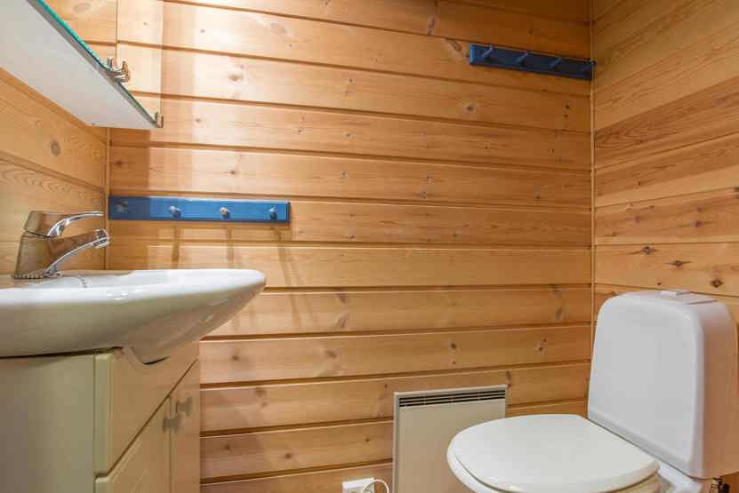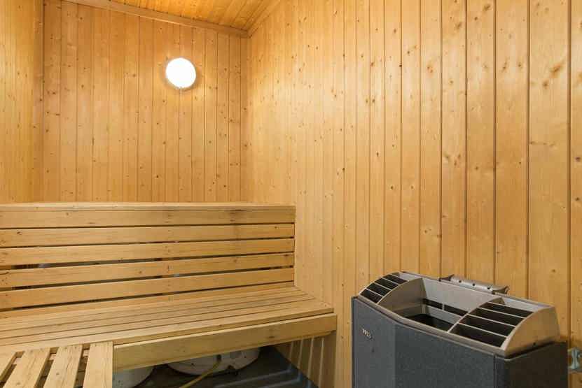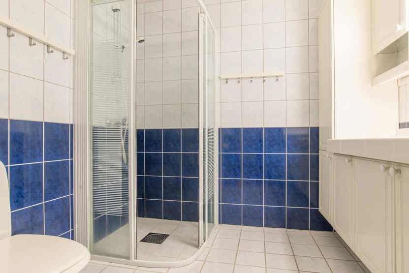 Bad 1 med bruser og WC. Bad 2 med bruser, WC, sauna og boblebad. Bad 3 med WC.