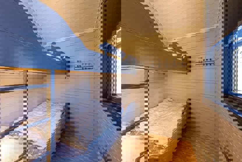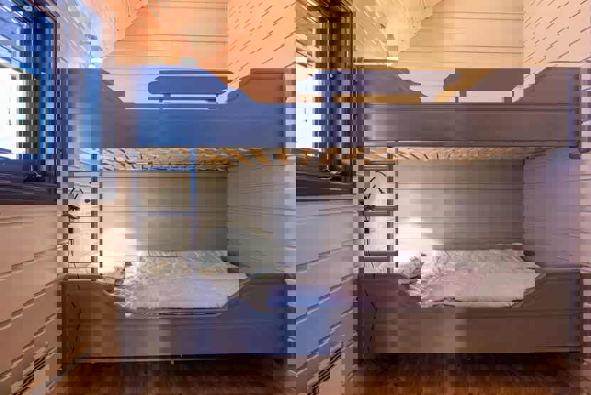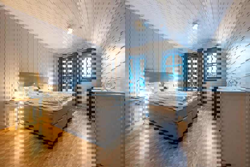 Soveværelse-1= 1 køjeseng 75 cm bred. Soveværelse-2= 1 køjeseng med 120 cm bred over og underkøje. Soveværelse-3= 1 dobbeltseng 180 cm bred. Soveværelse-4= 1 dobbeltseng 180 cm bred.