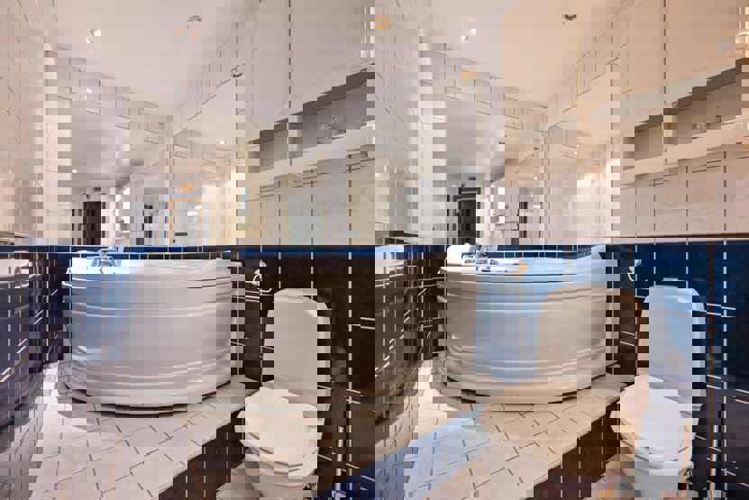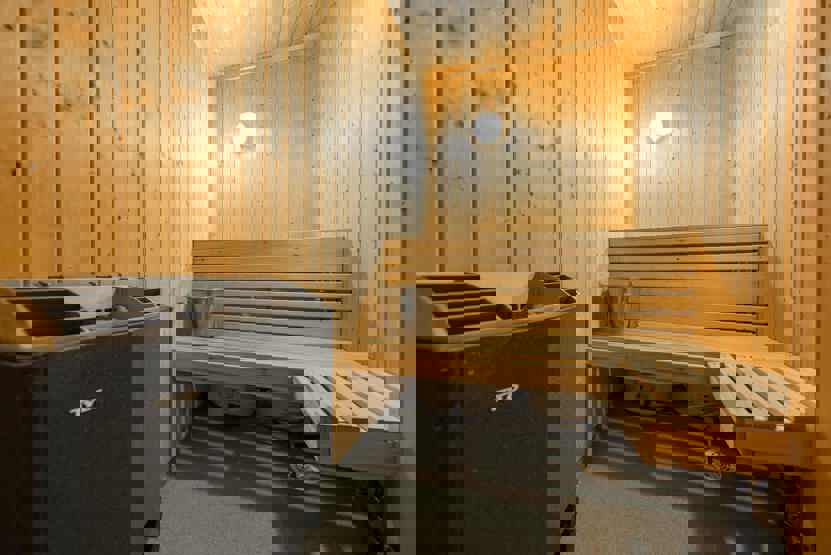 Bad 1 med bruser og WC. Bad 2 med bruser, WC, sauna og badekar. Bad 3 med WC.