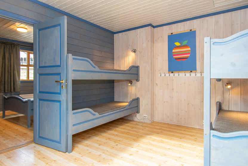 Soveværelse-1= 1 dobbeltseng. Soveværelse-2= 1 køjeseng med 120 cm bred over og underkøje. Soveværelse-3= 1 køjeseng. Soveværelse-4= 2 køjesenge. Soveværelse-5= 1 dobbeltseng, 1 køjeseng.