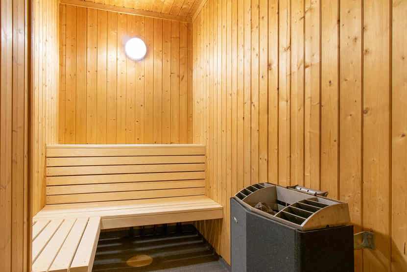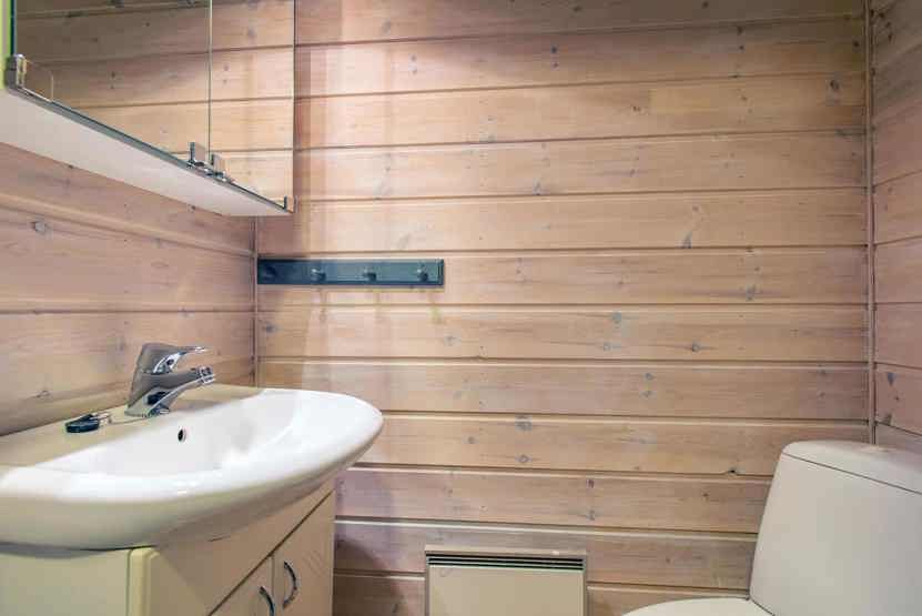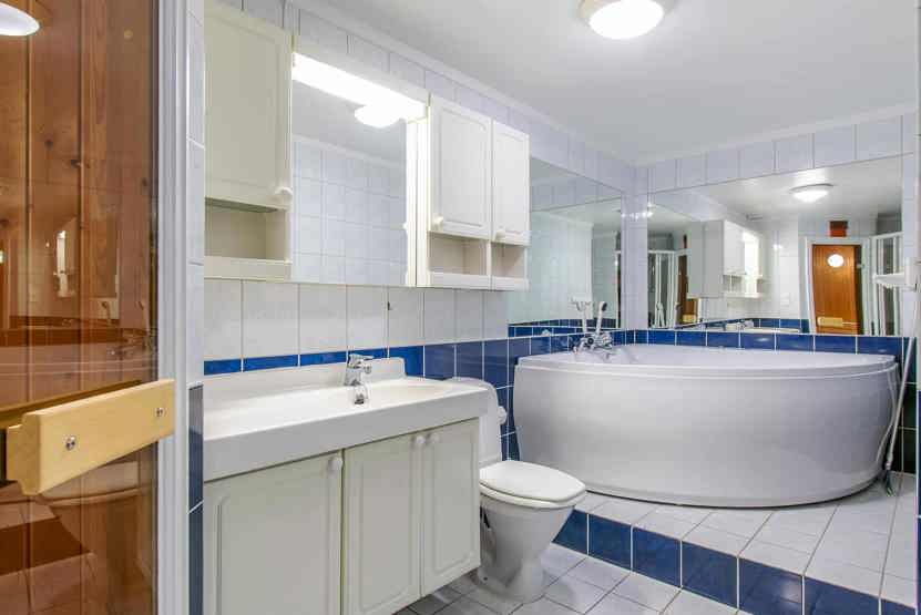 Bad 1 med bruser og WC. Bad 2 med bruser, WC, sauna og boblebad. Bad 3 med WC.