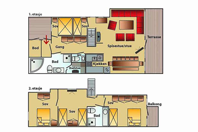 Lejligheden er i 2 etager og ligger på 1.sal, bedst egnet til 14 personer. 14+2 sengepladser 132 m², opholdsstue med brændeovn, TV og køkkenafdeling, spisebord og stole. 5 soveværelser, 2 brusere, 3 WC, 1 sauna, boblebad, vaskemaskine. Adgang til elbilopladere med type 2 stik mod betaling. Afstande: skilift 50 meter, langrendsløjper 300 meter, Afhængigt af sneforholdene kan afstanden til lift/bakke variere.