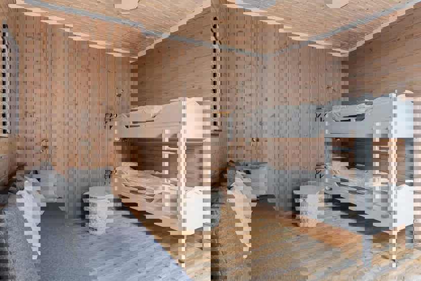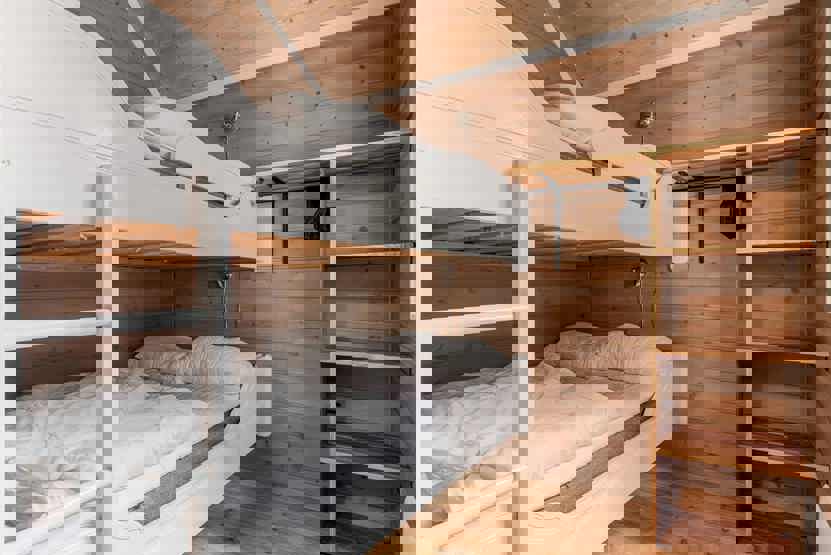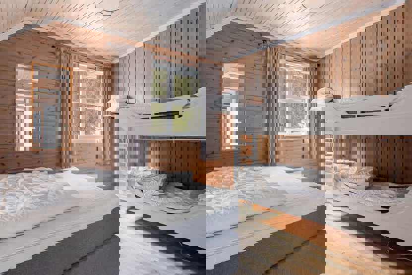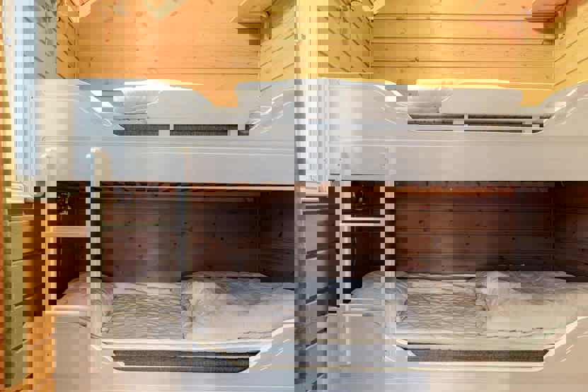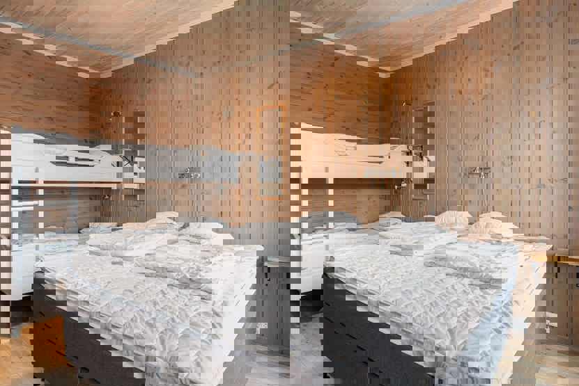 Soveværelse-1= 1 dobbeltseng. Soveværelse-2= 1 køjeseng med 120 cm bred over og underkøje. Soveværelse-3= 1 køjeseng. Soveværelse-4= 2 køjesenge. Soveværelse-5= 1 dobbeltseng, 1 køjeseng.