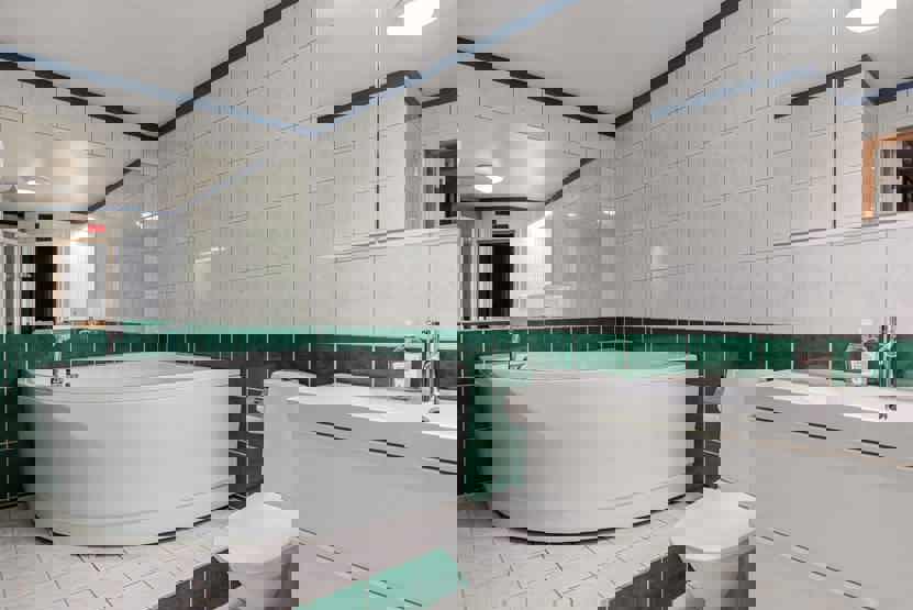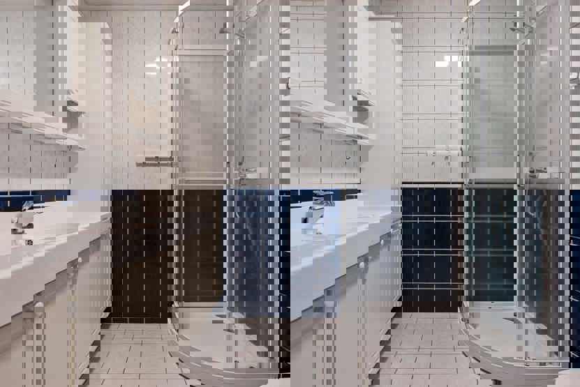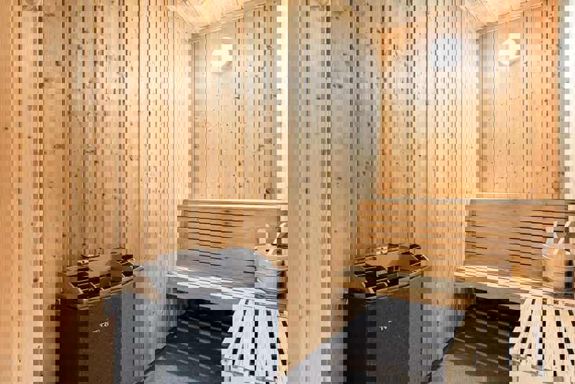 Bad 1 med bruser og WC. Bad 2 med bruser, WC, sauna og boblebad. Bad 3 med WC.