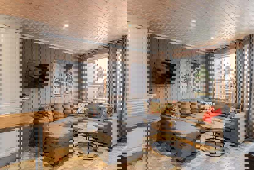 Lejligheden er i 2 etager og ligger på 1.sal, bedst egnet til 14 personer. 14+2 sengepladser 132 m², opholdsstue med brændeovn, TV og køkkenafdeling, spisebord og stole. 5 soveværelser, 2 brusere, 3 WC, 1 sauna, boblebad, vaskemaskine. Adgang til elbilopladere med type 2 stik mod betaling. Afstande: skilift 50 meter, langrendsløjper 300 meter, Afhængigt af sneforholdene kan afstanden til lift/bakke variere.