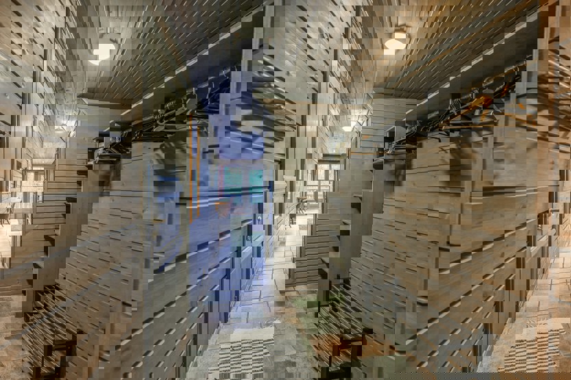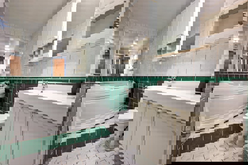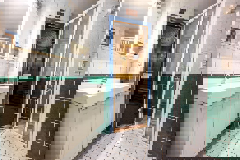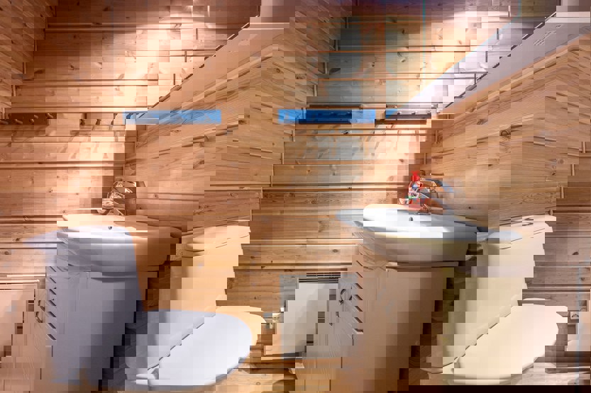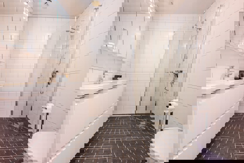 Bad 1 med bruser, WC, sauna og boblebad. Bad 2 med bruser og WC. Bad 3 med WC.
