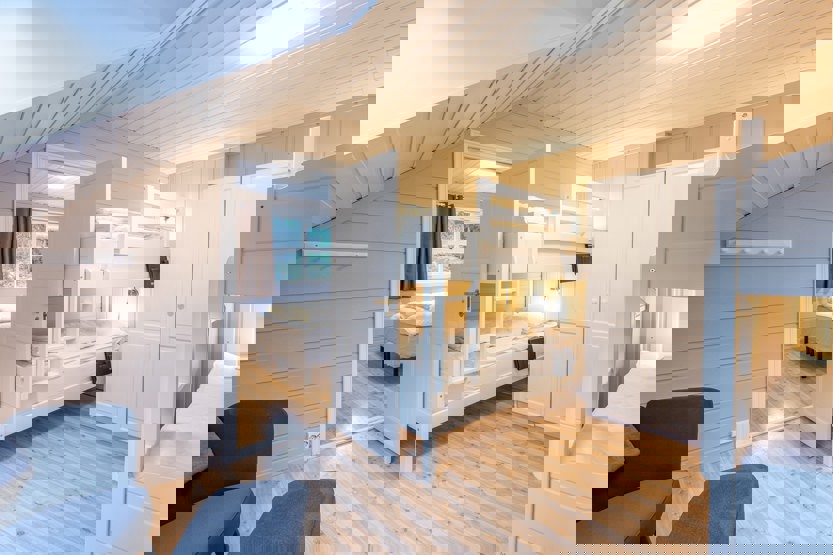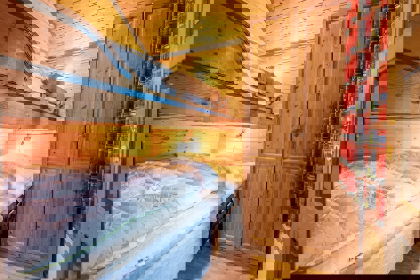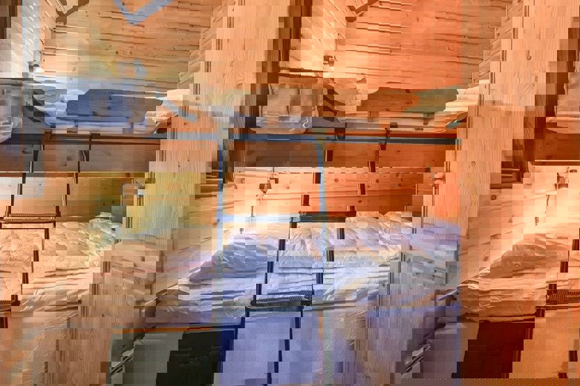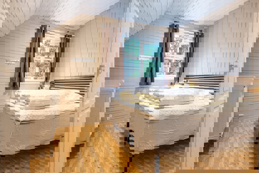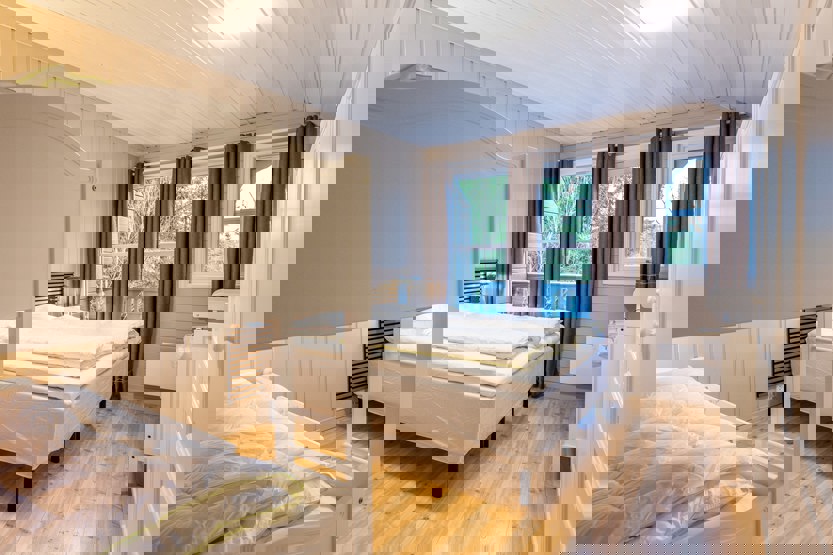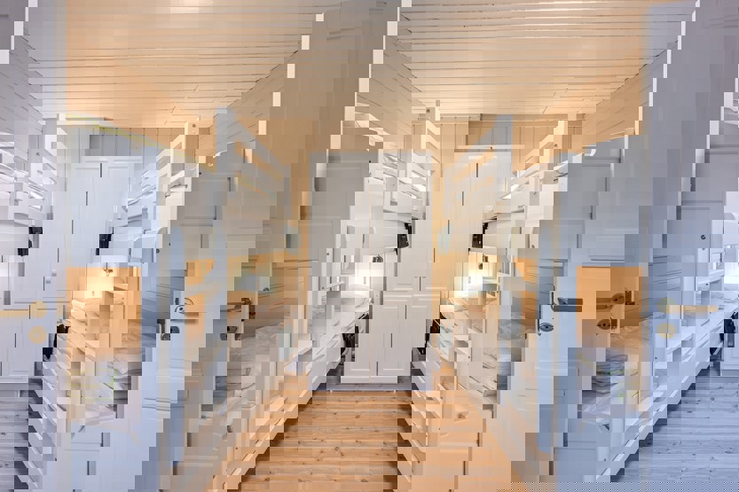 Soveværelse-1= 1 dobbeltseng 150 cm bred. Soveværelse-2= 1 dobbeltseng 150 cm bred, 1 køjeseng 75 cm bred. Soveværelse-3= 2 køjesenge hvor både over og underkøje er 90 cm bred. Soveværelse-4= 1 køjeseng med 140 cm bred underkøje og 120 cm bred overkøje. Soveværelse-5= 1 køjeseng 75 cm bred.
