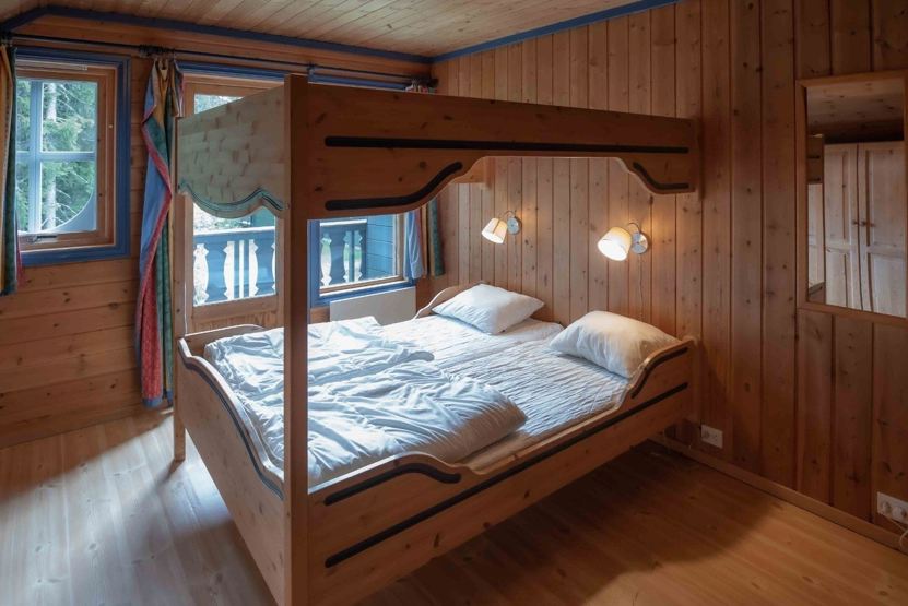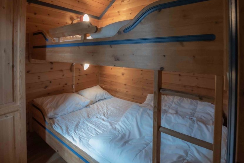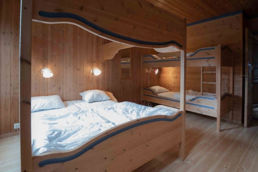 Soveværelse 1: 1 dobbeltseng 160 cm bred. Soveværelse 2: 1 køjeseng med 120 cm bred over og underkøje. Soveværelse 3: 1 køjeseng. Soveværelse 4: 2 køjesenge. Soveværelse 5: 1 dobbeltseng 150 cm bred, 1 køjeseng.