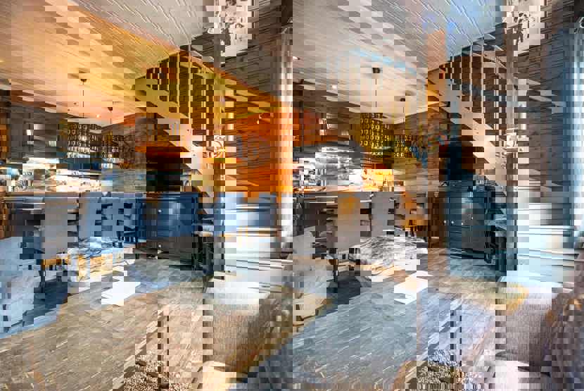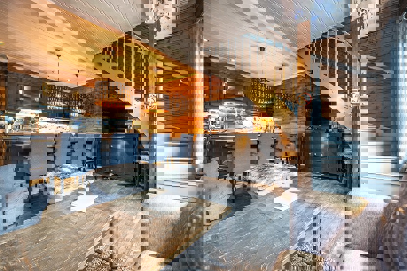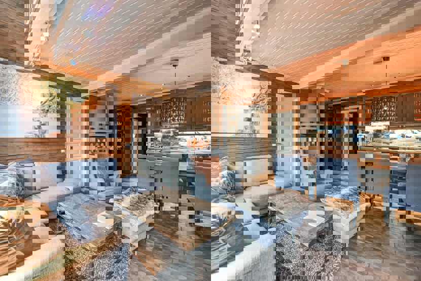 Bjørnebye Corner 709B, moderne og flot lejlighed i 2 etager med 11+1 sengepladser, 114 m², køkkenafdeling, opholdsstue, pejs, TV, 5 soveværelser, Hems 3 soverum og stue. Hemsen har skråvægge. 2 brusere, 2 WC, 1 sauna. Vaskemaskine, tørretumbler, tørreskab, skiopbevaring.