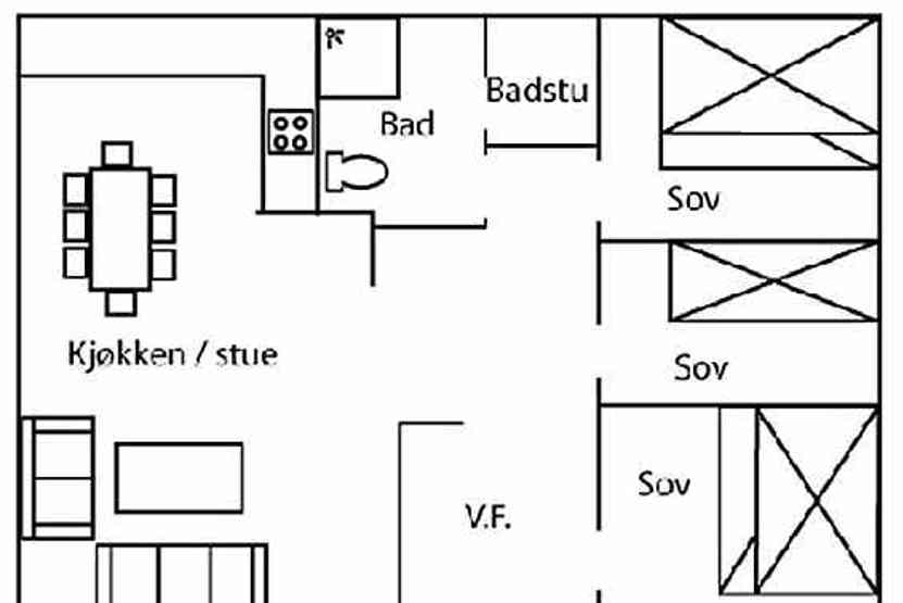 Soveværelse 2: 1 køjeseng med 120 cm bred underkøje. Soveværelse 3: 1 køjeseng.