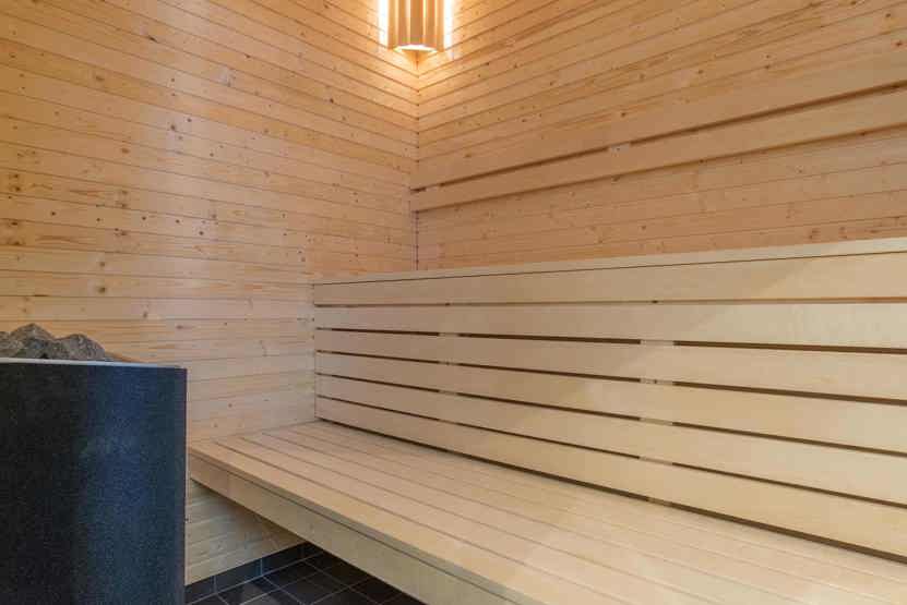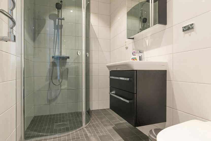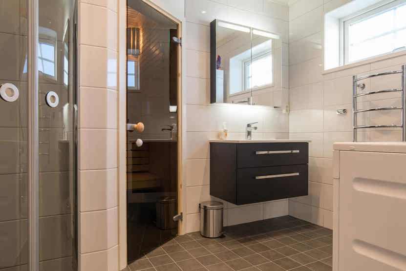Bad 1 med bruser og WC. Bad 2 med bruser, WC og sauna.