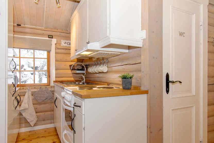 Enheden har komfur med ovn, køleskab, fryser, mikrobølgeovn.