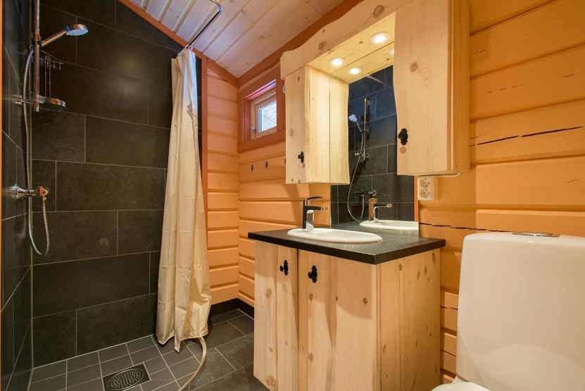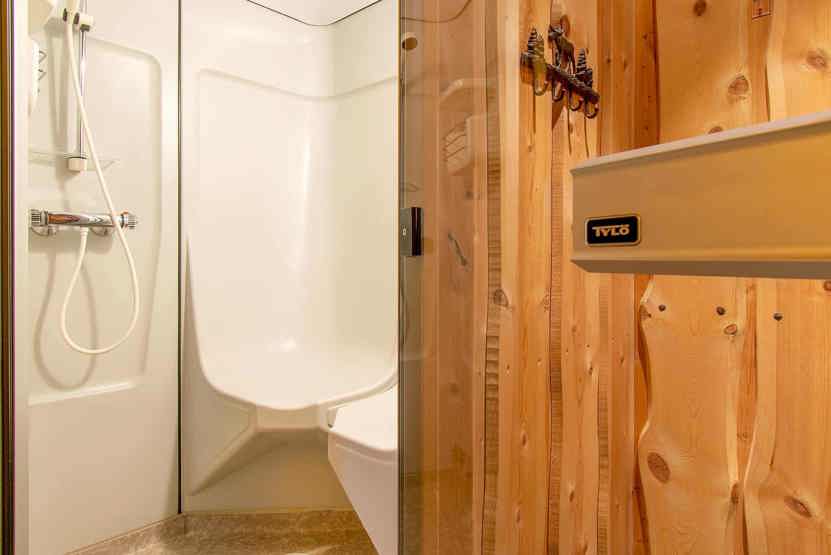 Bad 1: Bruser, WC og sauna. Bad 2: Bruser og WC.