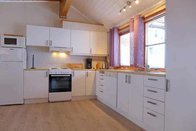 Enheden har komfur med ovn, opvaskemaskine, mikrobølgeovn, køleskab, fryser.